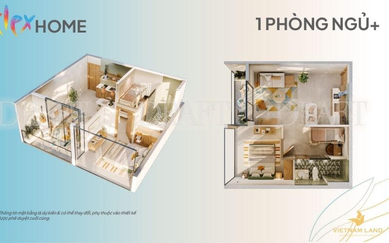 - Phòng ngủ: 1 phòng ngủ chính cộng thêm 1 không gian đa năng