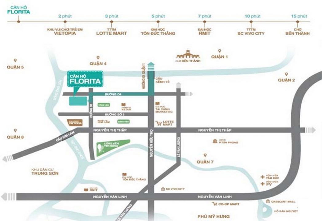 Florita có khả năng liên kết vùng vô cùng thuận lợi. Từ dự án di chuyển qua cầu Him Lam tới KDC Trung Sơn, cách Khu đô thị Phú Mỹ Hưng khoảng 5 phút di chuyển. Ngoài ra, cư dân dự án có thể di chuyển nhanh chóng về các quận lân cận như Quận 2, Quận 4, Quận 5, Quận 8…qua các tuyến đường giao thông trọng điểm như: Trục đường Nguyễn Hữu Thọ và đại lộ Nguyễn Văn Linh…