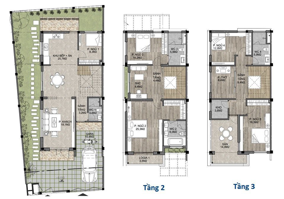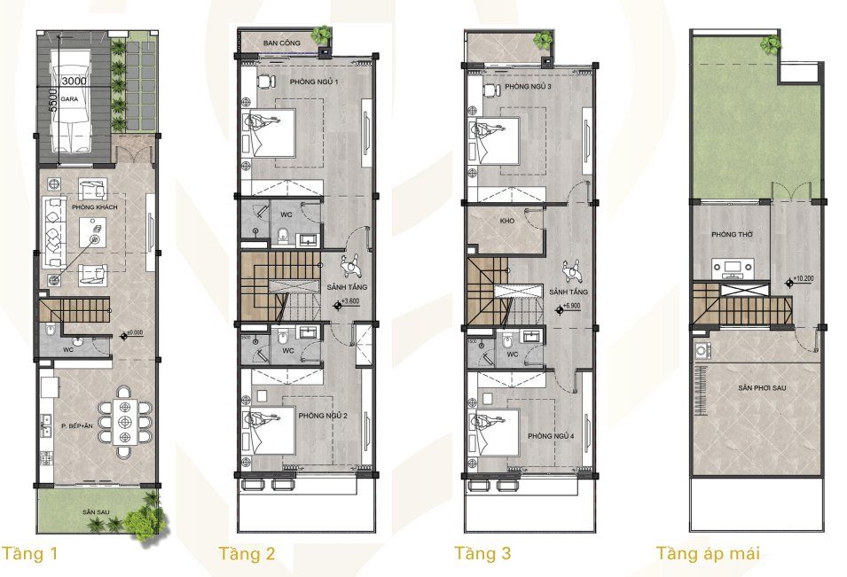 - Diện tích biệt thự song lập: 170m2 – 312m2