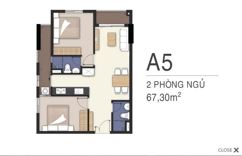 - Căn hộ 2 phòng ngủ có diện tích từ 56m2 – 76m2.
