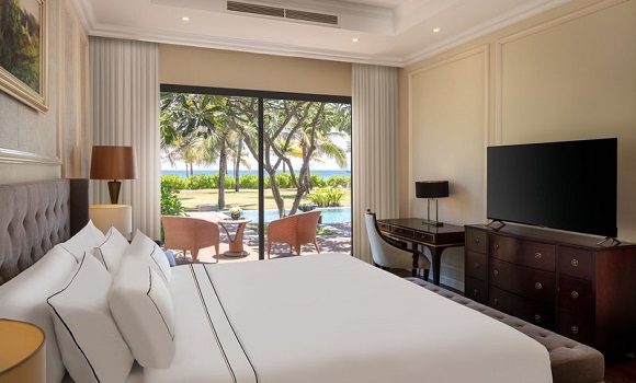 Phòng ngủ thường kết hợp ban công lớn và cửa kính giúp khách hàng có thể nằm thư giãn nghe sóng biển vỗ rì rào và ngắm trọn vẻ đẹp của biển cả.