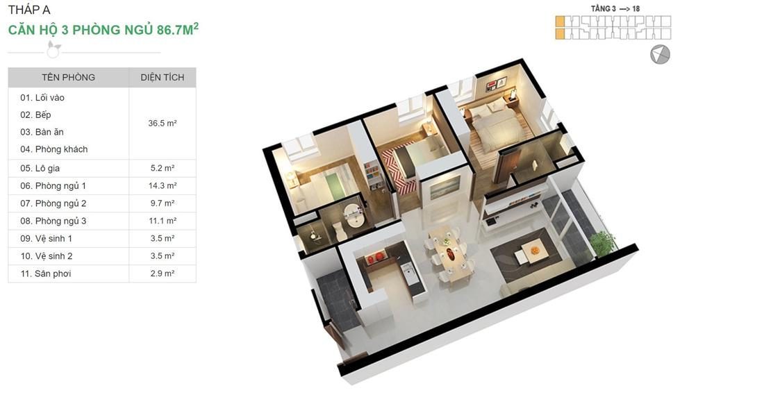 - Căn hộ 3 phòng ngủ diện tích 86.7m2, 98.2m2, 111.5m2, 122.8m2