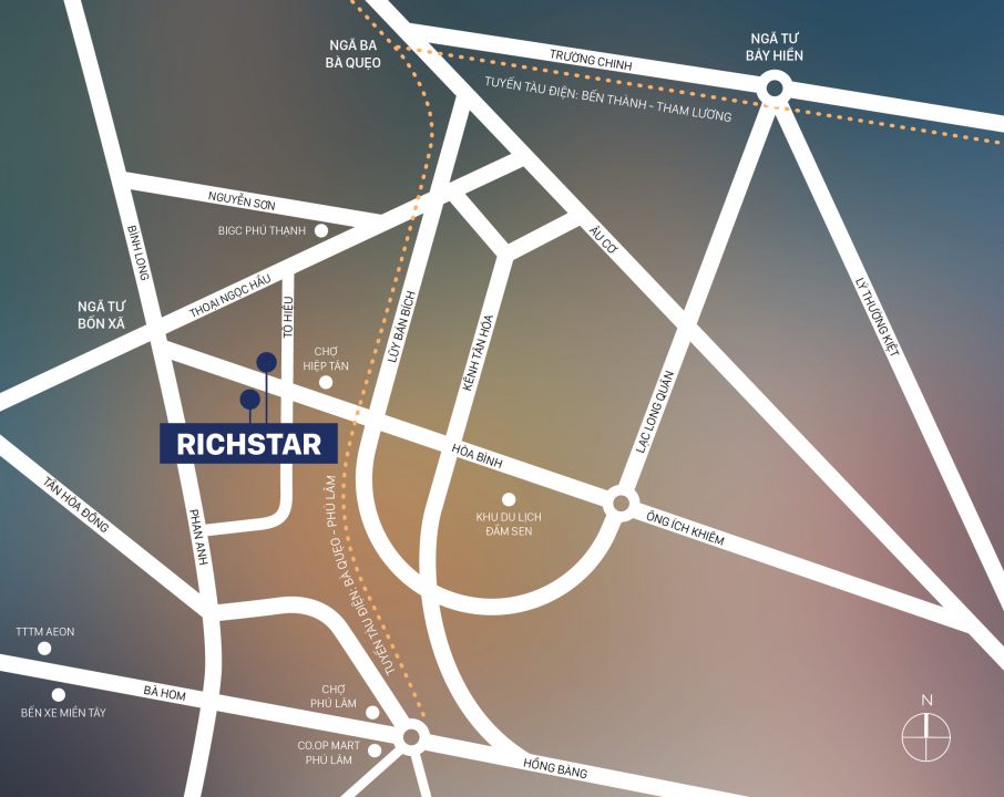 Chung cư Richstar có vị trí tại số 239 – 241 và số 278 đường Hòa Bình, thuộc Phường Hiệp Tân – Quận Tân Phú – Thành phố Hồ Chí Minh. Dự án sở hữu vị trí vô cùng đắc địa với mặt tiền trải dài 250m tuyến đường lộ giới thông thoáng tại khu vực trung tâm quận Tân Phú.