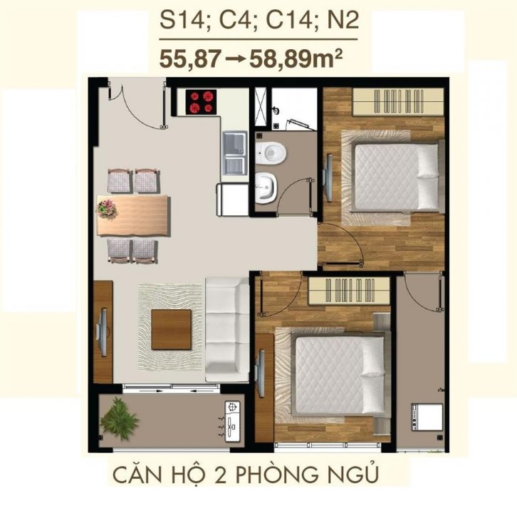- Căn hộ 2 phòng ngủ diện tích 55.87m2 – 80.05m2