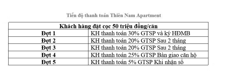 Bên cạnh đó, dự án Thiên Nam Apartment còn có các chính sách bán hàng hấp dẫn đưa dự án tới gần hơn với khách hàng và các nhà đầu tư.