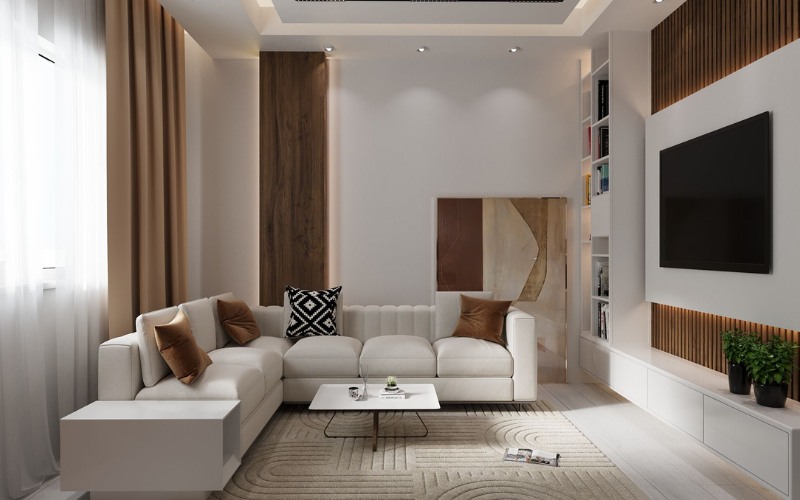 Phong cách phòng khách hiện đại tối giản đang trở nên rất phổ biến trong những năm gần đây, đặc biệt thích hợp cho các căn phòng có diện tích nhỏ từ 10m2 đến 15m2. Thay vì sử dụng những chiếc tủ cồng kềnh, giải pháp là sử dụng giá treo tường tiện dụng. Bàn ghế sofa thường là các loại sofa đơn, với chỉ một chiếc ghế dài được đặt sát vào tường để tạo cảm giác rộng rãi cho căn phòng.