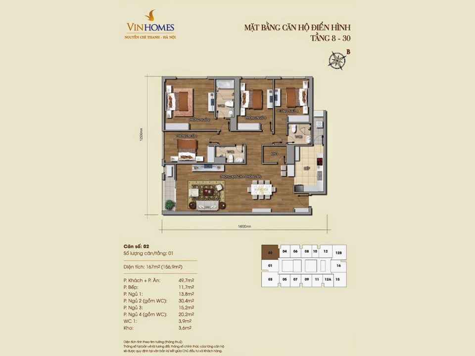 - Căn hộ 4 phòng ngủ có diện tích 167m2