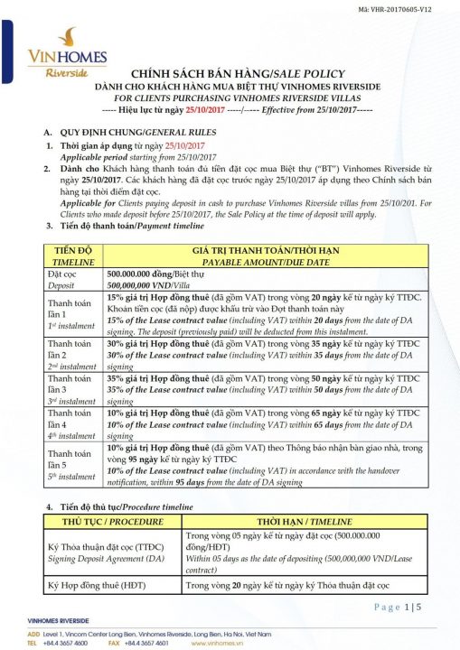 Dự án KĐT Vinhomes Riverside được chia thành 3 giai đoạn lớn. Giai đoạn 1 triển khai xây dựng từ 2011 – 2012. Giai đoạn 2 triển khai từ năm 2016 – 2017. Giai đoạn 3 triển khai từ năm 2019 – 2020.